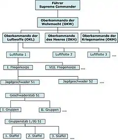 Меншим підрозділом у структурі Повітряних сил була ескадрилья, «штаффель» (нім. Staffel), яка формувалася з чотирьох ланок чи шести пар бойових літаків. Один з командирів ланки, у військовому звані оберлейтенант — гауптман, одночасно був командиром ескадрильї (нім. Staffelkapitaen (Staffelfuehrer). Зазвичай «штаффель» мав 12-16 літаків. Ескадрилья, у свою чергу, поділялася на ланки (нім. Kette), які в більшості родів авіації складалися з трьох літаків. У винищувальній авіації ланка нараховувала чотири літаки (нім. Schwarm), що поділялися на пари (нім. Rotte).