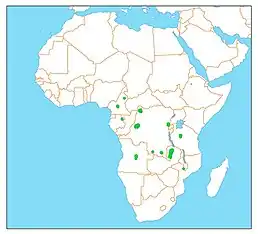 Вид поширений в Африці. Мозаїчно трапляється в Анголі, Камеруні, ДР Конго, Габоні, Малаві, Руанді, Танзанії і Замбії.