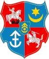 • в червоному полі рука з мечом, а в клейноді — поясна фігура воїна з мечем.