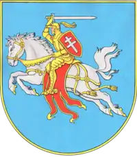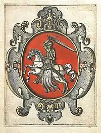 | Той Наримунт мав герб, або клейнод, лицерства свого такий, і тим печатувався, Великому князівству Литовському зоставив його, a то такий: в гербі муж збройний, на коні білому, в полі червоному, меч голий, яко би кого гонячи тримав над головою, і є ізвідти названий «Погоня» [6]. |