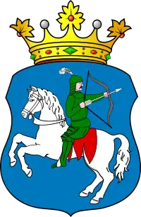 У синьому полі срібний вершник, що стріляє з лука позад себе.