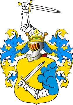 • у золотому полі рука в обладунку з оголеним мечом, яка виходить із хмар; ця фігура повторюється в клейноді (шляхетський герб «Погоня»);