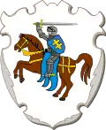 • у червоному полі вершник в обладунку та шоломі на білому коні. В його правій руці — оголений меч, а в лівій — щит із шестиконечним хрестом, на коні сідло з трьомя кінцями;