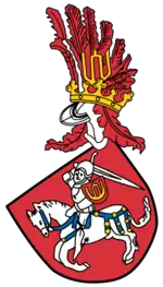 У червоному полі лицар у срібних обладунках з золотим подвійним хрестом на синьому щиті на срібному коні заносить меч. Герб вінчає княжа корона. Вважається родовим гербом Гедиміновичів.