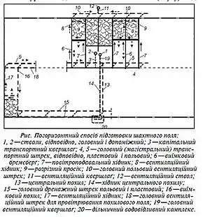 Відпрацювання виїмкових смуг здійснюється за падінням або підняттям. У кожній смузі може бути одна або дві лави. Підготовка пласта починається з проведення на рівні основного горизонту двох головних штреків — польового і пластового. Біля верхньої технічної межі проводиться головний польовий вентиляційний штрек, головний польовий відкатний штрек, призначений для транспортування видобутого вугілля, обладнується звичайно електровозною відкаткою. По пластовому штреку доставляються матеріали та устаткування. Від головного пластового штреку проводяться конвеєрний бремсберґ і вентиляційний хідник, які оконтурюють з двох боків виїмковий стовп (смугу). Відстань між похилими виробками визначається довжиною лави і змінюється у широких межах — від 100 до 230 м. Довжина виїмкових стовпів приймається від 1000 до 1800—2000 м. Біля верхньої межі шахтного поля похилі виробки з'єднуються розрізним просіком. Очисний вибій переміщуватиметься вниз за падінням. При великому обводненні порід стовпи краще відробляти лавами, що рухаються за підняттям.