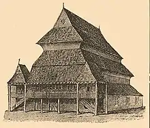 Стіни були з горизонтальних брусів, в головному залі вони були посилені ребрами.