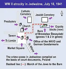 Згідно з висновками розслідування Інституту національної пам'яті Польщі (ІНП), 10 липня 1941 р. в селі Єдвабне група польського населення вчинила погром та вбила щонайменше 300 єврейських сусідів, а 40 було вбито раніше. Більшість із них — чоловіків, жінок і дітей — спалили живцем у сараї.[3] В заяві Інституту про остаточні висновки розслідування від липня 2002 р. повідомляється, що виконавцями злочину були щонайменше 40 польських жителів Єдвабного та околиць.[4]