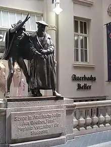 Своєю популярністю «Погріб Ауербаха», що став ще в XVI столітті одним з найзнаменитіших винних погребів міста, зобов'язаний насамперед Йогану Вольфгангу Гете. Під час свого навчання в Лейпцигу в 1765—1768 роках він частенько заглядав до «Погреба Ауербаха» і чув давню легенду про те, що тут відомий чорнокнижник Йоганн Фауст проскакав сходами до виходу на вулицю верхи на великій діжці, тож, мовляв, така справа не обійшлася без допомоги диявола. Подейкують, що ця історія й це місце надзвичайно вразили Гете, і саме тому «Погріб Ауербаха» став місцем дії першої частини його трагедії «Фауст». Насправді Гете знав цю історію ще з дитинства, оскільки на ярмарках нераз бачив дуже популярну в той час лялькову виставу про Фауста.