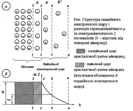 Оскільки поверхня частинки має заряд, у просторі, що оточує частинку, виникає електричне поле, характер зміни потенціалу якого по мірі віддалення від поверхні мінералу показано на рис. б. Потенціал φ поля на міжфазній поверхні називається повним або термодинамічним, а на межі шарів Штерна і Гюї — електрокінетичним або дзета-потенціалом ξ.