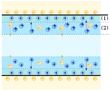 Одна обкладка ПЕШ представляє собою позитивні заряди зі сторони металу, інша — негативні заряди аніонів з боку розчину.