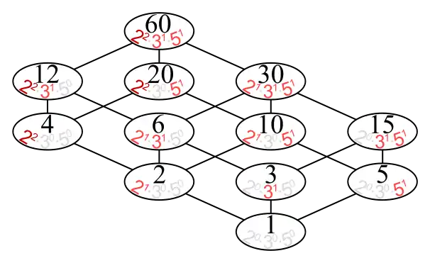 - Множиною всіх додатних дільників 60 є, , частково впорядкована множина, якій відповідає діаграма Гассе: