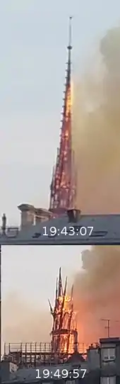 Через годину після того, як почало спостерігатися полум'я, покритий свинцем дерев'яний дах собору, у тому числі його центральний шпиль, був охоплений вогнем[20][21], що стало причиною його обвалення на склепіння собору[15]. Велика частина дерев'яних конструкцій, які зайнялися, були «лісом» собору: деревину з приблизно 21 гектара (0,21 км²) дуба зрізали для будівництва собору в XII і XIII століттях. Приблизно 210 тонн свинцевого листа над деревиною завершали дах собору[22]. Розплавлений свинець створював небезпеку для пожежників[23].