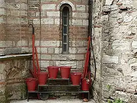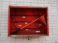 - Відра конусні (пожежні конуси) виробляються із тонколистового металу або пластику, фарбуються у червоний колір. Місткість 7 — 8 літрів, маса металевого відра близько 1 кілограма. Зазвичай на пожежному щиті поміщаються два відра.