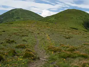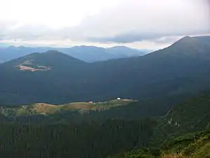 Вид на г. Говерлу (ліворуч), г. Пожижевська (поцентрі) і г. Данциж (праворуч) з г. Туркул