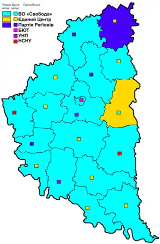 | Партія | ВО «Свобода» | Єдиний центр | Партія регіонів | |