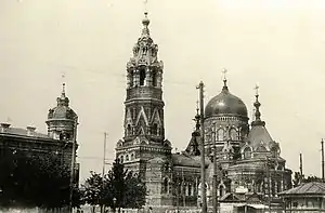 Будівля була побудована у псевдоросійському стилі і мала в ширину 16 сажнів (34 м), у довжину 25 сажнів (53 м) і у висоту, з урахуванням хреста, 25 сажнів (53 м). Висота дзвіниці становила 35 сажнів (74,5 м), з головним дзвоном вагою 300 пудів (5100 кг).