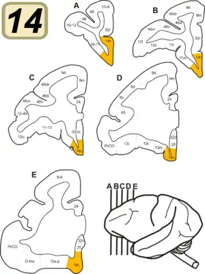 ![]() Префронтальна кора капуцина (Cebus). BA14 виділене помаранчевим на вінцевих розтинах. | |