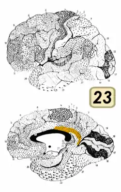 ![]() Медіальна поверхня мозку. Поле BA23 показане зеленим. | |