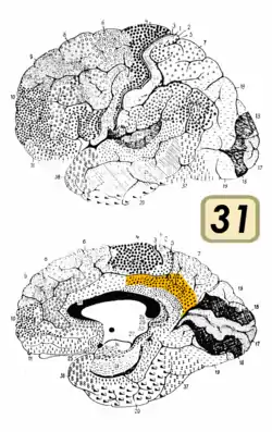 ![]() Медіальна поверхня головного мозку людини. BA31 виділене червоним | |