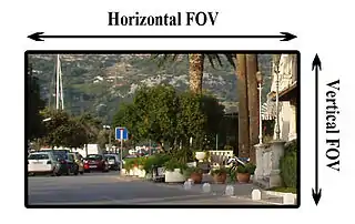 Горизонтальні і вертикальні кути поля зору обчислюються з наступних рівнянь:[3]