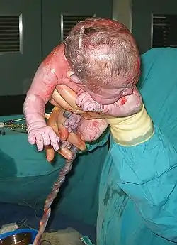 - вигнання плоду — продовжуються скорочення матки, що супроводиться потугами, передлежача частина плода (найчастіше голова) розтягує зовнішні статеві органи, і плід народжується (через 3—5 хвилин після народження перерізають пуповину);