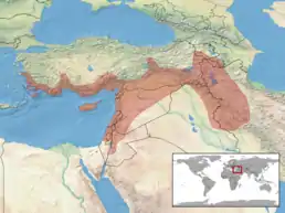 Мешкає у Болгарії, Албанії, Румунії, Угорщині, Македонії, на островах Егейського моря, у Сирії, Ізраїлі, Іраку, Лівані, Ірану, Кувейті, Йорданії.