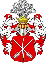 Щит увінчаний дворянським нашоломником і короною. Нашоломник: п'ять страусиних пір'їв. Намет на щиті червоний, підкладений сріблом.