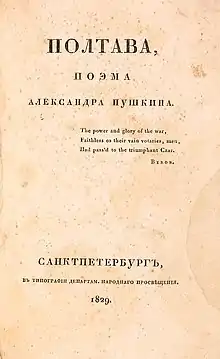 Для своєї поеми, Пушкін використав слова з поеми Байрона як епіграф. Це не випадково, адже поштовхом до написання поеми «Полтава» стало невдоволення Пушкіна тим, що Джордж Байрон у своїй поемі «Мазепа» (1819) зобразив українського гетьмана відважним та шляхетним героєм, а не як лиходія та пройдисвіта, як того бажав Пушкін.[9] Загалом, Пушкін відгукнувся критично на байронівського «Мазепу»: