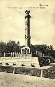На честь перемоги московитів у битві 1709-го року в місті Полтава за часів московського самодержавства було збудовано кілька пам'ятників — Монумент Слави (1811), Пам'ятник на місці відпочинку Петра I (1849), Захисникам Полтави і коменданту фортеці Олексію Келіну (1909). З нагоди 200-х роковин Полтавської битви було також збудовано каплицю святого великомученика Юрія Переможця.
