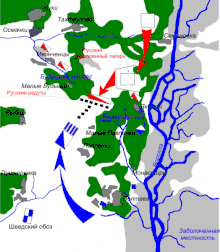- Перший етап. Шведське військо рано вранці під прикриттям ранкової темряви неочікувано для ворога починає атаку та проривається в тил московського війська у проміжках між установленими московитами редутами. Після цього шведи атакують московську кінноту, що розташована за редутами.