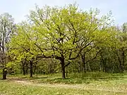 З галявини «Шведського лісу» (за червоним дубом) відкривається вид на ставок № 1, на галявину «Української діброви» та на квітучий навесні бузок.