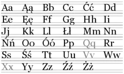 - Q, V та X використовуються тільки в словах іноземного походження, які не полонізувалися.