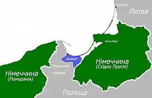Західний кордон з Німеччиною був визначений Версальським договором, за яким Сілезію розділили між Німеччиною та Польщею, а переважно німецький Данциг (сучасне польське місто Гданськ), що мав сильні економічні зв'язки з Польщею, був оголошений вільним містом[6]. В 1922 році після декількох повстань польського населення у Верхній Сілезії Польща змогла взяти цю провінцію під свій контроль. Для забезпечення виходу Польщі до Балтійського моря з колишніх німецьких територій був утворений «польський коридор», який відрізав Східну Пруссію від Німеччини, перетворивши її в анклав. У результаті захід країни був населений переважно німцями, що робило Польщу вразливою в питаннях територіальних претензій з боку Німеччини.