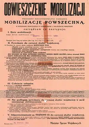 Наприкінці серпня в Польщі офіційно була оголошена мобілізація. Попри це в попередні місяці вже були сформовані всі передбачені резервні частини (полки, окремі батальйони та артилерійські дивізіони), але їх зарахували до кадрових з'єднань. Було передбачене об'єднання резервних частин у 10 дивізій, але з бажання зберегти в таємниці всі ці приготування цього не зробили до 1 вересня 1939 року.