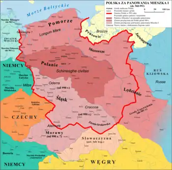 Перший певний князь був Мешко I. За свого правління 966 він запровадив християнство. Мешко I і його наступник Болеслав I Хоробрий (967—1025) у боротьбі з німецькими володарями досполучали польські землі. На заході вони провадили боротьбу з Німецькою імперією за Помор'я, на півдні в конфлікті з Чехією долучили Силезію й Малопольщу із Краковом, на сході зіткнулися з об'єднавчими силкуваннями Київської Русі, що консолідувала східнослов'янські племена (Червенські гради та Перемишль переходили з рук у руки). У 1025 році Болеслава I Хороброго короновано, а державу названо Королівство Польське. Уживаючи княжого права, володар обкладав населення натуральними данинами та повинностями, сприяв розвитку ремесла, зміцнював укріплені центри — гроди. Потроху з князівської дружини склався стан земельних власників (можновладців) і лицарів-шляхти (владики). Селянство — кмети — підлягало тільки королю. Потреби державного управління спонукали створити провінції та їхній адміністративний апарат. Столицею було Гнезно, потім — Познань, а із серед. XI ст. — Краків.
