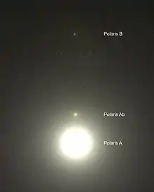 Полярна зоря насправді являє собою потрійну зоряну систему[8]. У центрі системи розташований надгігант (Полярна А), що яскравіша Сонця більш як у 2000 разів. Полярна B розташована на значному віддаленні від Полярної А, тому побачити її в телескопи можна навіть із поверхні Землі. Однак карликовий супутник центральної зорі — Полярна Ab — розташована так близько до гіганта, що сфотографувати його вдалося лише орбітальному телескопу «Габбл», і то лише після переналагодження устаткування[9]. Період обертання Полярної Ab становить близько 30 років[10].