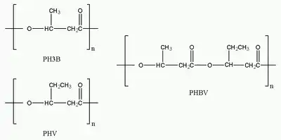 Полі-3-гідроксибутірат (P3HB), одна з форм PHB, ймовірно є найзвичайнішою формою полігідроксиалканоатів, проте мікроорганізми виробляють і багато інших форм, зокрема полі-4-гідроксибутірат (P4HB), полігідроксивалерат (PHV), полігідроксигексаноат (PHH), полігідроксиоктаноат (PHO) та їх кополімери.
