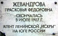 - Жевандрова Параска Федорівна (пом. 1907) — агент ленінської «Іскри» на півдні Росії;