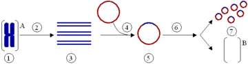 (1) Хромосомна ДНК організму A. (2) ПЛР. (3) Багато копій одного гену з організму A. (4) Вставлення гену в плазміду. (5) Плазміда з геном з організму A. (6) Вставлення плазміли в організм B. (7) Експресія гену з організму A в організмі B.