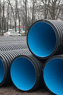 Для будівництва безнапірних мереж (наприклад, зливової та технічної каналізації) великого діаметра (понад 1000 мм) можуть використовуватисяспіральновітие труби з порожнистої стінкою замкнутого профілю з поліетилену. Вони виготовляються з поліетилену трубних марок ПЕ100, ПЕ80, ПЕ63 методом навивання безперервно виробленого профілю на обертовий циліндричний барабан з одночасною зварюванням витків між собою. Геометрична форма профілю стінки такої труби забезпечує високу опірність деформації. Як правило, спіральновітие труби випускаються двох типів — SN4 і SN8, які відрізняються по класу кільцевої жорсткості (4 кН / м ², 8 кН / м ²).