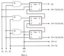 Якщо коефіцієнти bj замінити кодами чисел у двозначній системі числення, то отримаємо вектор F(xi), який встановлює зв'язок між розрядами аргумента xi і функції f(k)(k=1,2,…,6):