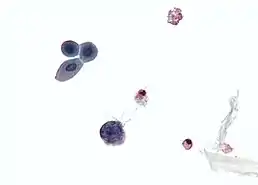![]() Мікрографія, де відображена заражена клітина поліомавірусом — велика синя клітина внизу від центру. Зразок цитології сечі. | ||||||