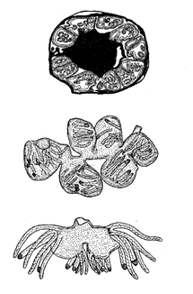 1. Єдина клітина в превітеллогенному ооциті. Кожна клітина містить два ядра (одне велике і одне маленьке гаплоїдне, що щільно до нього прилягає). Більше ядро починає «огинати» менше, так що врешті-решт менше ядро разом з невеликим об'ємом цитоплазми опиняється всередині більшого. Таким чином утворюється маленька клітина всередині великої клітини. Ядро маленької клітини лишається гаплоїдним, в той час як великої — стає поліплоїдним; згодом організм паразита стає диплоїдним, але як саме це відбувається, досі невідомо.