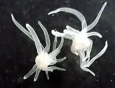 5. В воді столон фрагментується на бруньки, з яких формуються медузоподібні вільноживучі особини з 24-ма щупальцями, що завдяки двом більшим парам щупальців пересуваються, «ходячи» по ґрунту, а решта використовується для харчування та захисту. Ці медузоїди ростуть та розмножуються поділом вздовж провздовжної осі, поділ починається від аборального полюса і закінчується на оральному; перед поділом на аборальному полюсі організму формується набір щупалець, аналогічний основному.