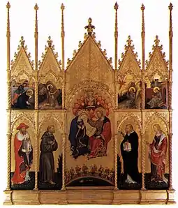 Містичному і споглядацькому духу головних дощок протиставляється жвавість викладення чотирьох невеликих історій святих, первісне розміщення яких в пределах загальної композиції картини не зрозуміле. Як і ця картина вбивства св. Петра, усі сюжети розвиваються на фоні гірських краєвидів і міських перспектив. Динаміка фігур чотирьох святих (Ієроніма, Франциска, Домініка і Магдалини) направлена до центральної картини, наче підкоряючись певній містичній процесії, що слідує через квітучий сад (натяк на земний рай Едем). Тоді як Коронування Богоматері, що знаходиться в центрі, поміщене у золоте сяйво Емпірея.