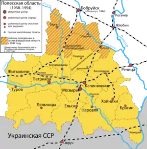 Перед німецько-радянською війною в області проживало близько 670 тисяч жителів на території близько 26 тис. км². Спочатку область включала 15 адміністративних районів. У 1939 р. утворено Октябрський і Калинковицький райони. На 1 січня 1941 року область складалася з 17 районів:
