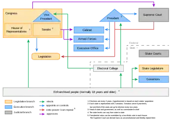 Виконавчу гілку влади очолює Президент, формально вона є незалежна від законодавчої і судової влади. Уряд служить як радники Президента, що складається з віце-президента і глав виконавчих департаментів. Законодавча влада здійснюється двома палатами Конгресу, Сенату і Палати представників. Судова гілка влади, складається з Верховного Суду і нижчестоящих федеральних судів. Судова функція полягає в трактуванні Конституції США та федеральних законів і нормативних актів. Це включає в себе вирішення спірних питань між виконавчою і законодавчою гілками влади. Федеральний уряд описано в Конституції.
