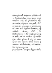 Арістотель проявляє еллінський патріотизм, стверджуючи, що тільки в еллінів мужність та розум знаходяться в гармонії. У європейців є мужність, але не вистачає розуму, тоді як в азіатів є розум, але бракує мужності (с. 601)[1].