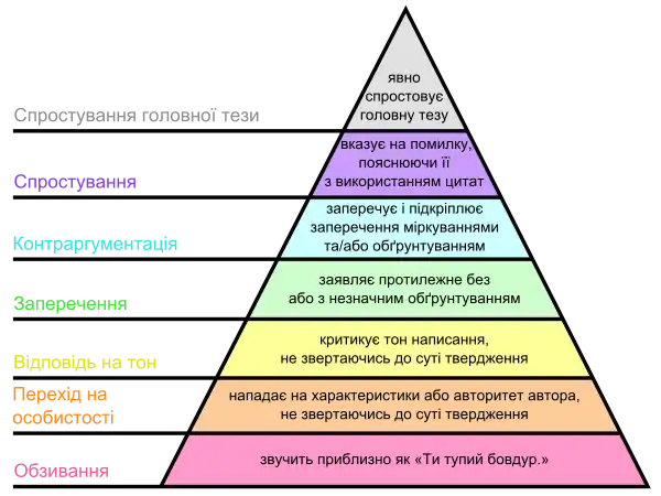 Трикутна діаграма, що представляє «діаграму незгоди» від ясного спростування до простої лайки, що базується на есе Пола Грема від березня 2008 року «Як не погоджуватися»[15]: