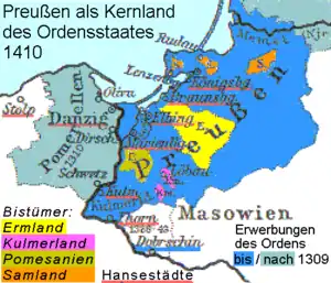 Князь Мазовії Конрад I Мазовецький запросив лицарів Тевтонського ордену для захисту своїх теренів від нападів прусів (1225). Хрестоносці прибули 1230 до Кульму, звідки наступного року почали наступ на Помезанію. Перейшовши Віслу, заклали місто Торунь (нім. Thorn), перший замок Марієнвердер (нім. Marienwerder). Вождь помедів Пепін безуспішно атакував Торунь, був захоплений і страчений. Генріх ІІІ Майсенський[3] 1234 виграв велику битву під прусським поселенням Ґревозе (Grewose), захопивши його. Помезани взяли участь у І прусському повстанні (1242/49), знову володіли містом Ґревозе (1242/47), який хрестоносці Генріха фон Ліхтенштейна захопили (1248), заклавши замок Хрістбурґ на новому місці (нім. Christburg). Тоді ж заклали Голланд (нім. Preußisch Holland)), Марієнбурґ (нім. Mariaeburgum) (1250). Помезанія була першою землею Пруссії, що була колонізована хрестоносцями і охрещена. Помезанія не брала участі у ІІ прусському повстанні[4] (1260–1274), через що на неї здійснювали набіги ятвяги, барти. Попри те, що Помезанія першою з прусських земель була атакована хрестоносцями, тут до XVI ст. збереглись звичаї, мова, що дозволило скласти словник прусської мови і Катехізис на цій мові[5].